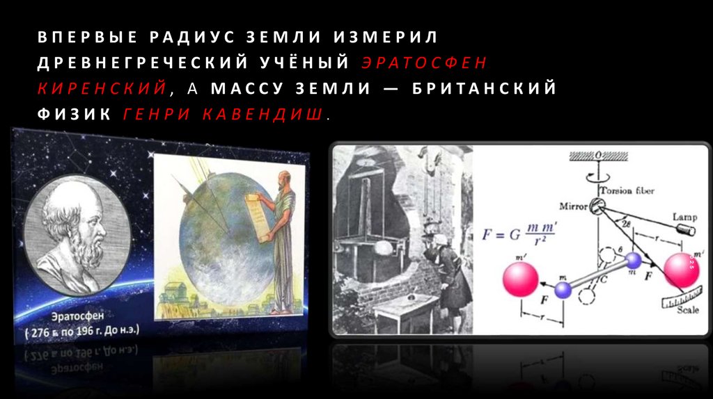 Д О К Л А Д Н А Т Е М У " РА Д И У С И М А С С А З Е М Л И "2. Впервые радиус Земли измерил древнегреческий учёный Эратосфен Киренский, а массу Земли — британский физик Генри Кавендиш.