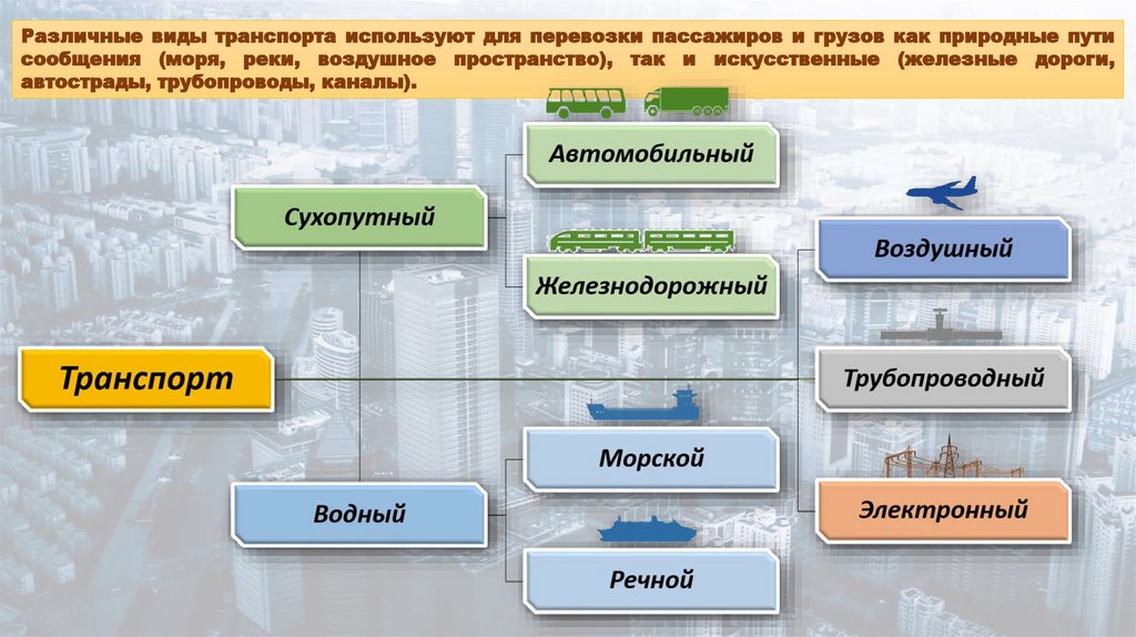 Различные виды транспорта используют для перевозки пассажиров и грузов как природные путисообщения (моря, реки, воздушное пространство), так и искусственные (железные дороги,