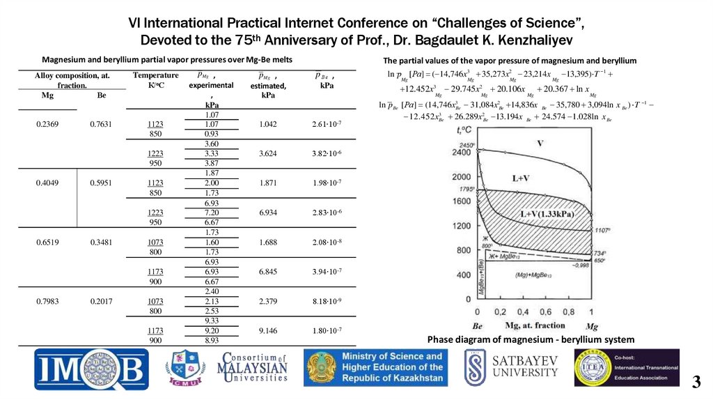 ln pBe [Pа] (14,746x 31,084x 14,836x Be 35,780 3,094ln x Be ) T 1