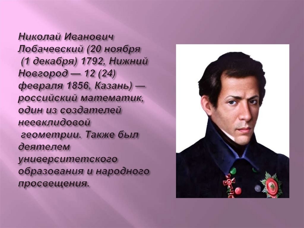 2. Николай Иванович Лобачевский (20 ноября (1 декабря) 1792, Нижний Новгород — 12 (24) февраля 1856, Казань) — российский
