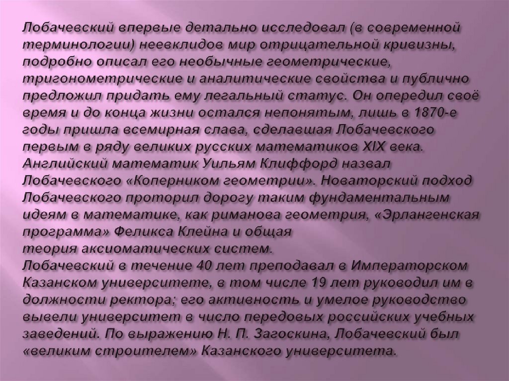 3. Лобачевский впервые детально исследовал (в современной терминологии) неевклидов мир отрицательной кривизны, подробно описал его