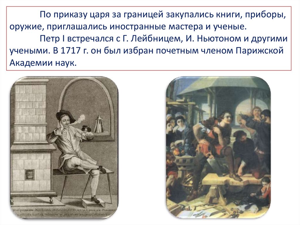 По приказу царя за границей закупались книги, приборы,оружие, приглашались иностранные мастера и ученые.