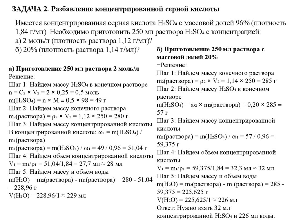 ЗАДАЧА 2. Разбавление концентрированной серной кислотыИмеется концентрированная серная кислота H₂SO₄ с массовой долей 96% (плотность