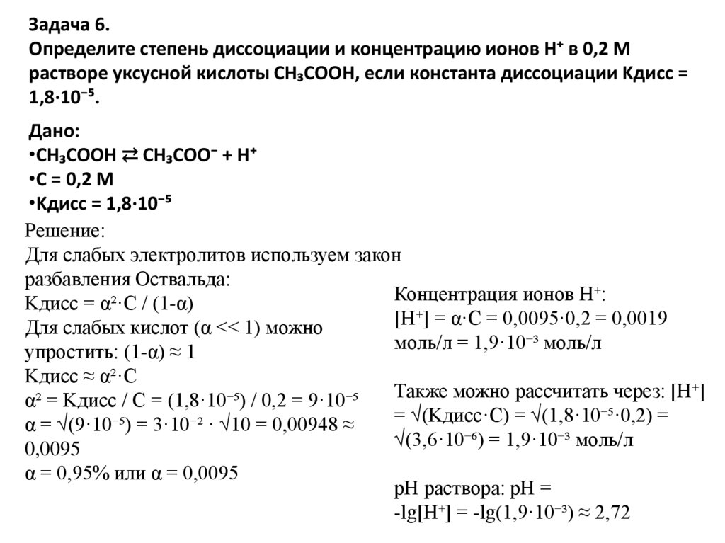 Задача 6.Определите степень диссоциации и концентрацию ионов H⁺ в 0,2 М