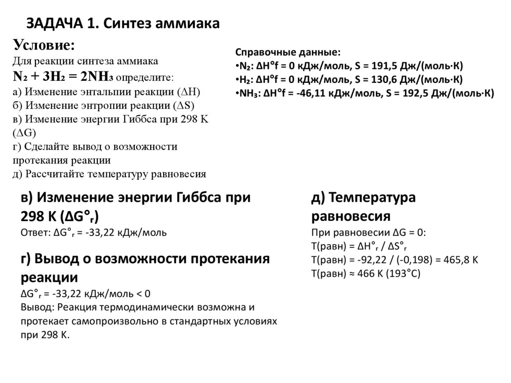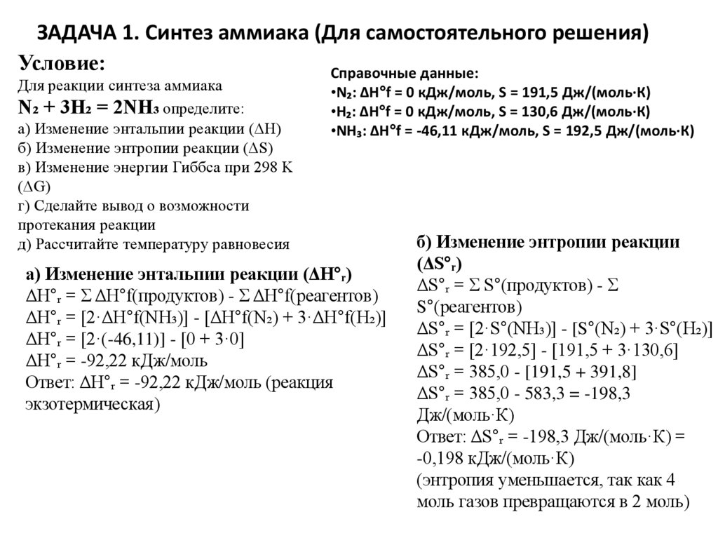 ЗАДАЧА 1. Синтез аммиака (Для самостоятельного решения)Условие: