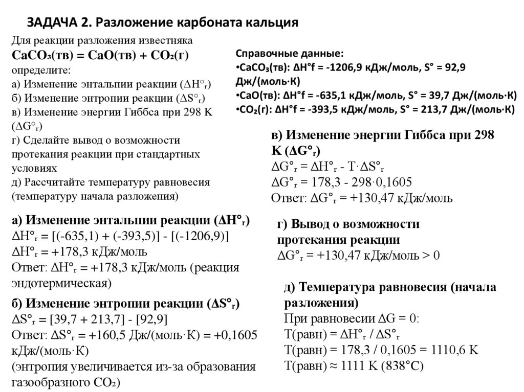 ЗАДАЧА 2. Разложение карбоната кальцияДля реакции разложения известняка