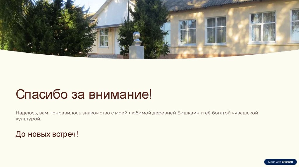 Спасибо за внимание!Надеюсь, вам понравилось знакомство с моей любимой деревней Бишкаин и её богатой чувашской