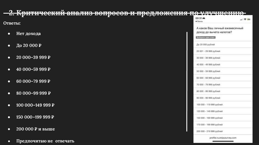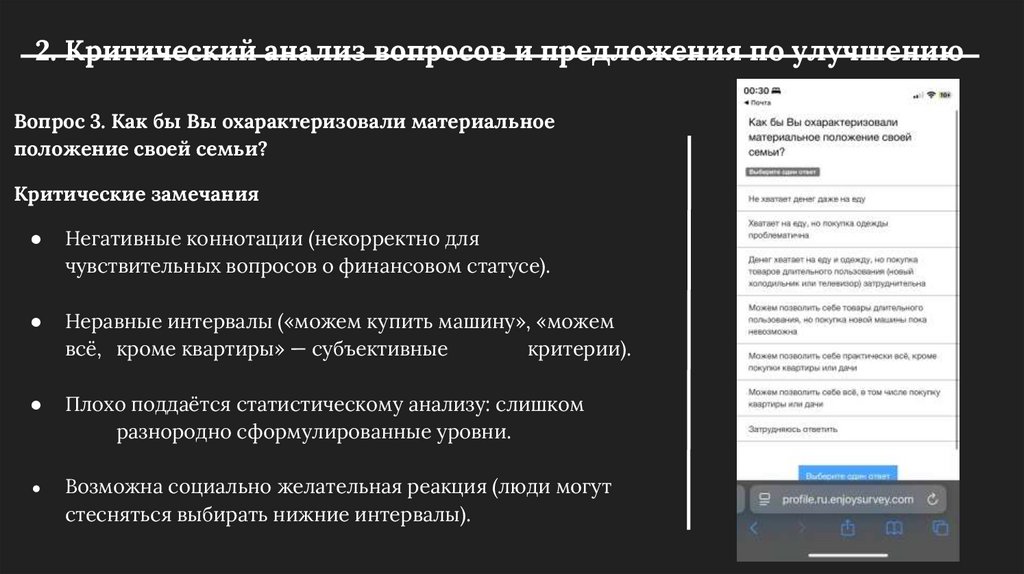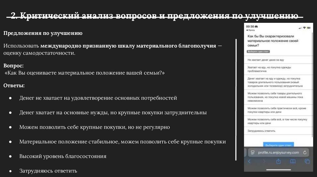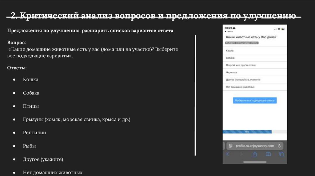 2. Критический анализ вопросов и предложения по улучшениюПредложения по улучшению: расширить списков вариантов ответа