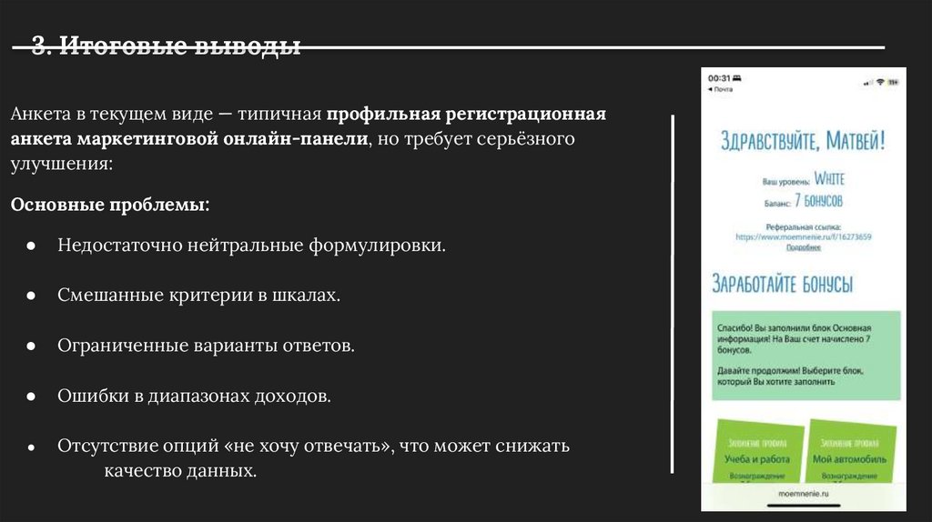 3. Итоговые выводыАнкета в текущем виде — типичная профильная регистрационная
