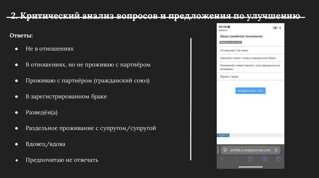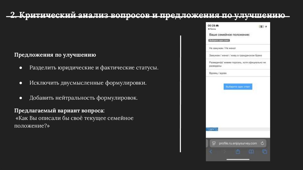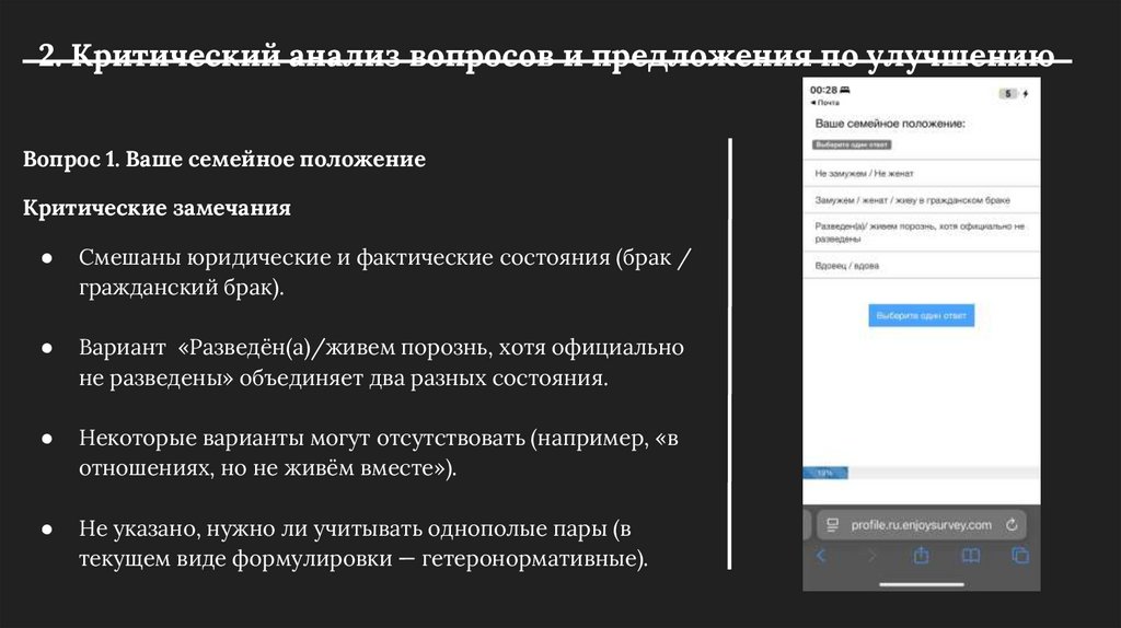 2. Критический анализ вопросов и предложения по улучшениюВопрос 1. Ваше семейное положение