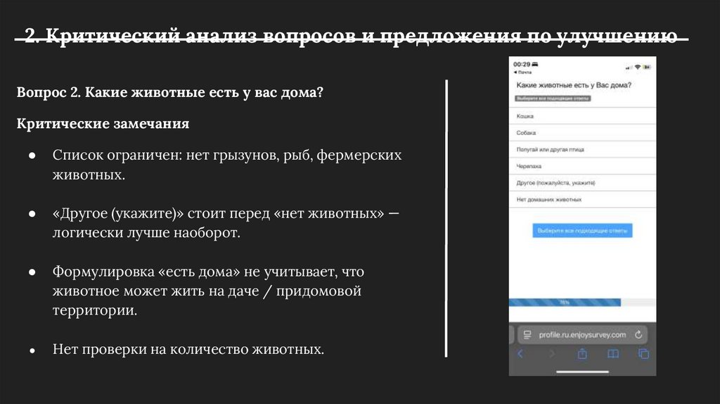 2. Критический анализ вопросов и предложения по улучшениюВопрос 2. Какие животные есть у вас дома?