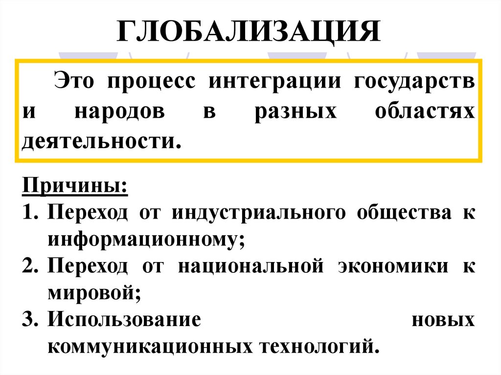 Глобализация – процесс всемирной экономической,политической, культурной и религиозной интеграции и