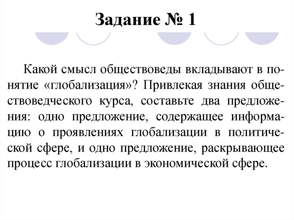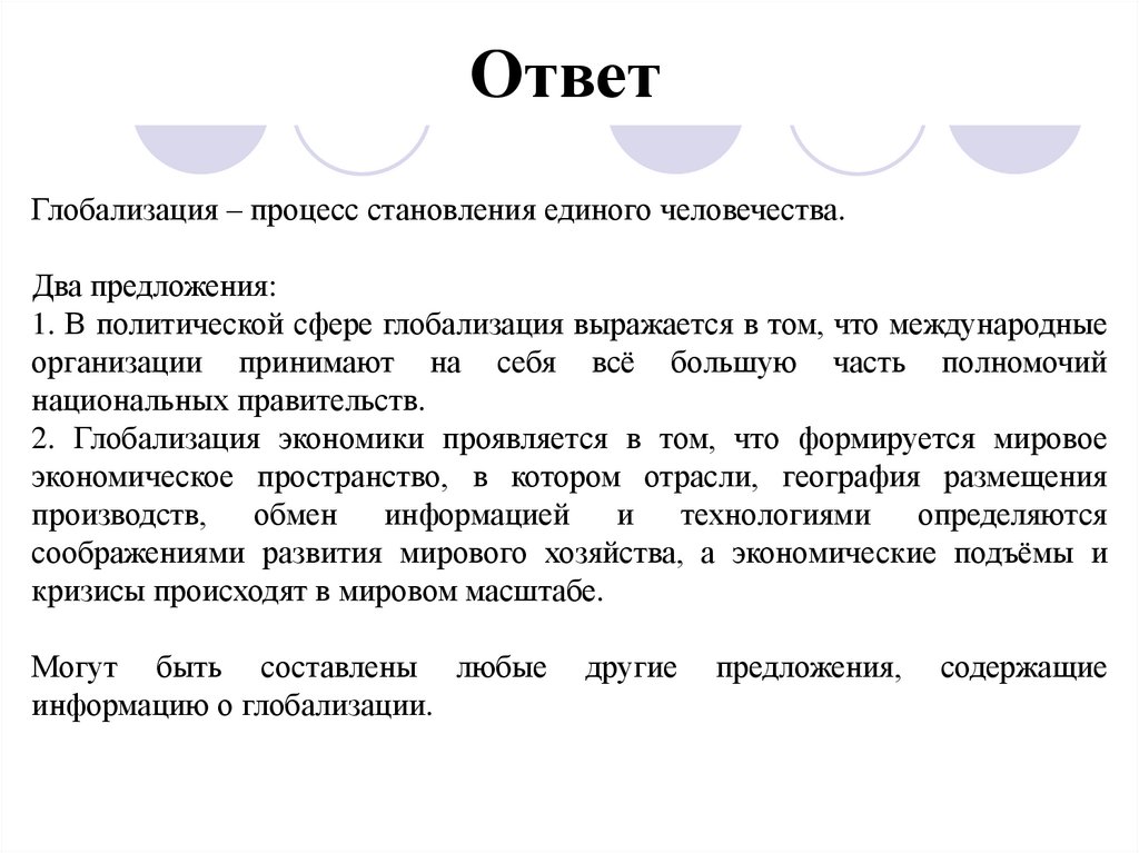 Какой смысл обществоведы вкладывают в понятие «глобализация»? Привлекая знания обществоведческого курса, составьте два предложения: одно предложение, содержащее информацию о проявлениях глобализации в политической сфере, и одно предложение, раскрывающеепроцесс глобализации в экономической сфере.