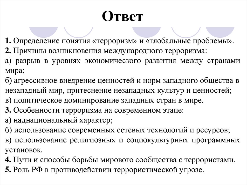 1. Определение понятия «терроризм» и «глобальные проблемы».2. Причины возникновения международного терроризма: