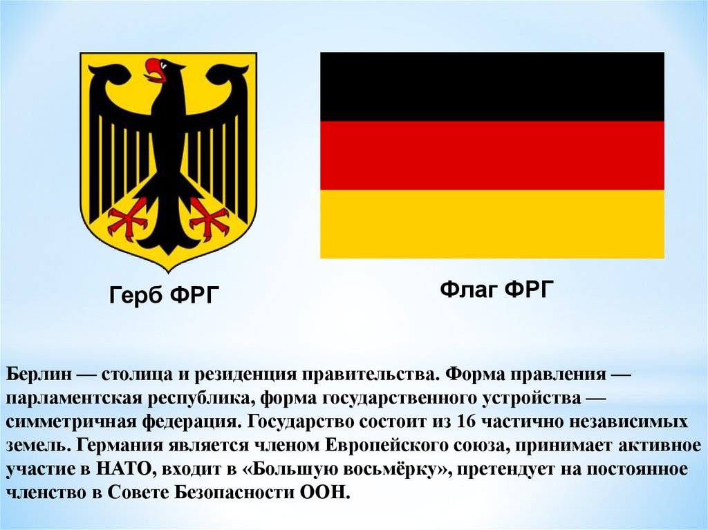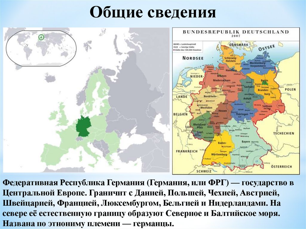 Общие сведенияФедеративная Республика Германия (Германия, или ФРГ) — государство в