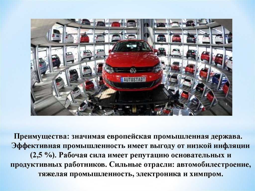 Преимущества: значимая европейская промышленная держава.Эффективная промышленность имеет выгоду от низкой инфляции