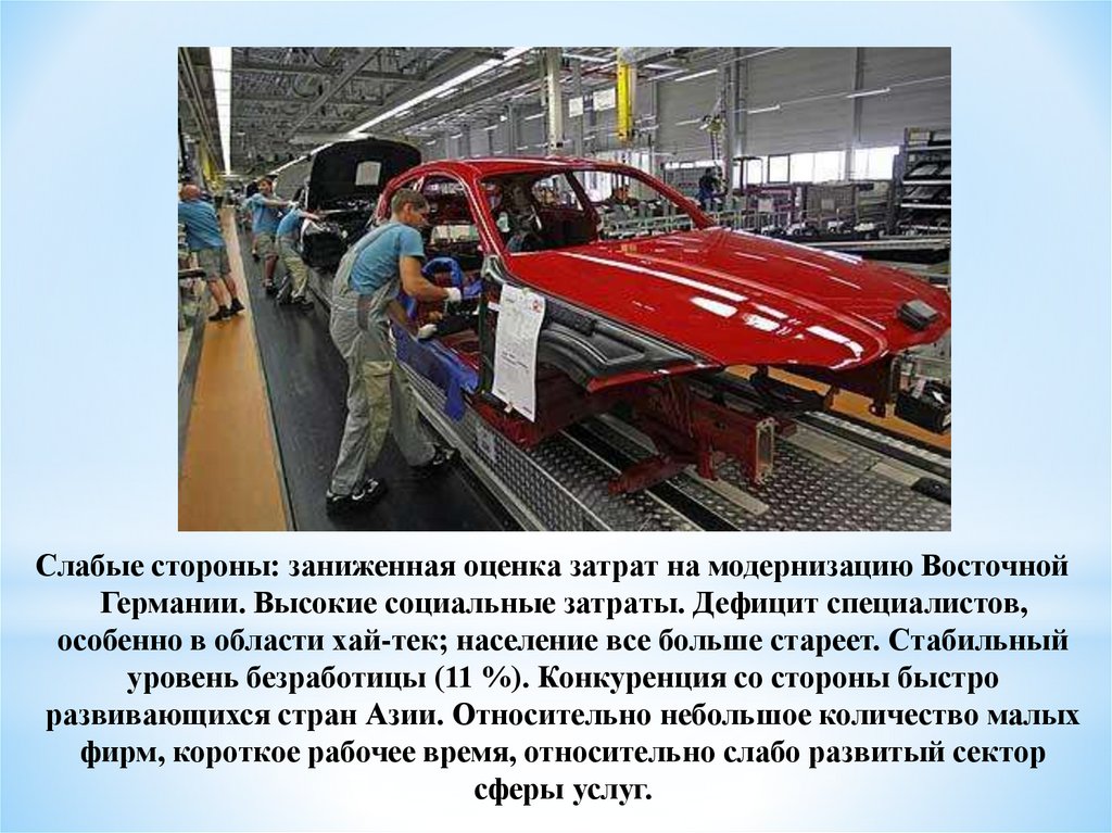Слабые стороны: заниженная оценка затрат на модернизацию ВосточнойГермании. Высокие социальные затраты. Дефицит специалистов,