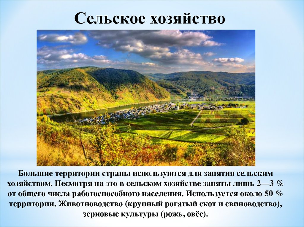 Сельское хозяйствоБольшие территории страны используются для занятия сельским