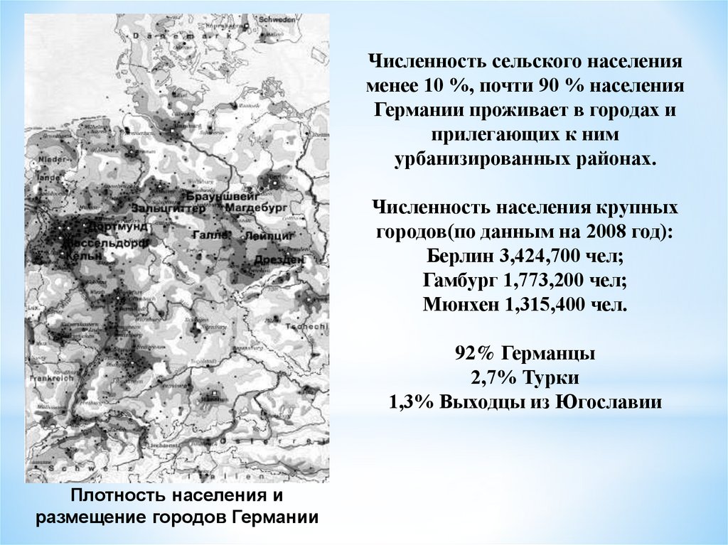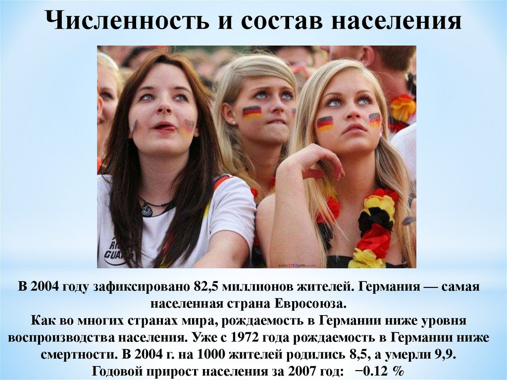 Численность и состав населенияВ 2004 году зафиксировано 82,5 миллионов жителей. Германия — самая