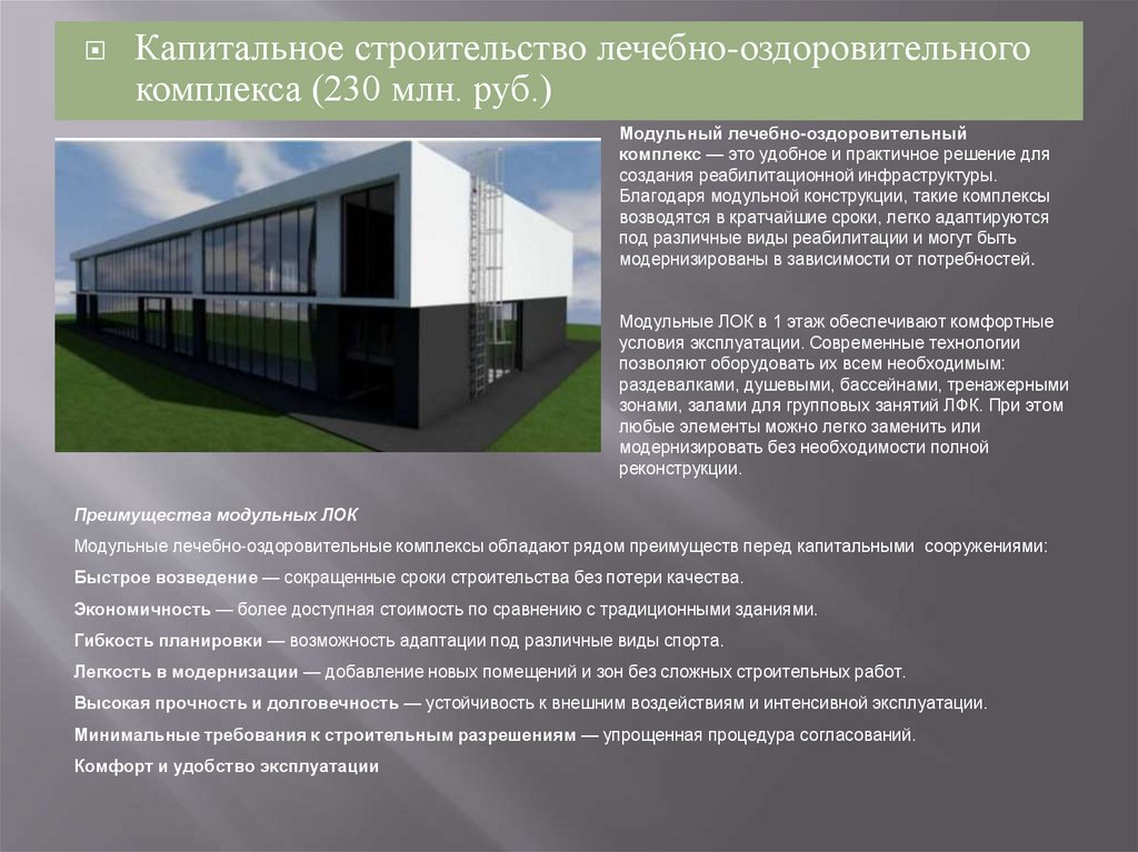 Модульные лечебно-оздоровительные комплексы обладают рядом преимуществ перед капитальными сооружениями: