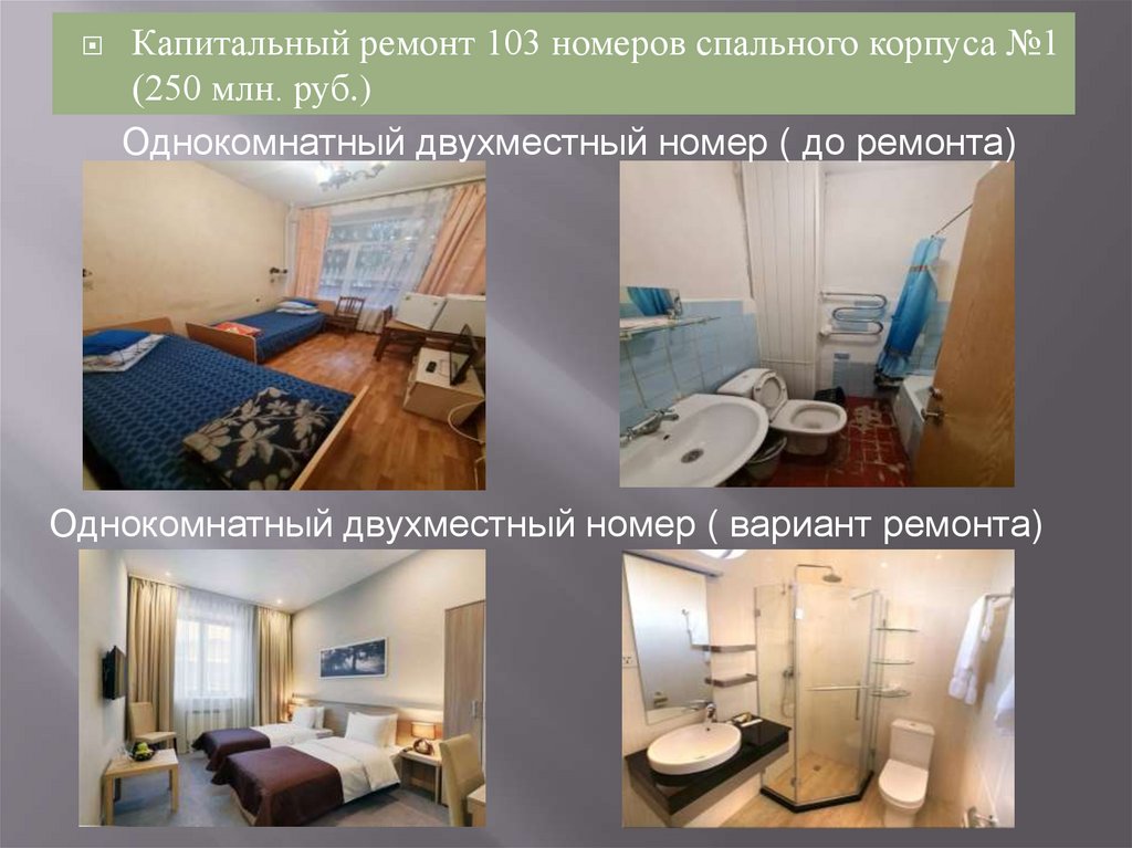 Капитальный ремонт 103 номеров спального корпуса №1(250 млн. руб.)