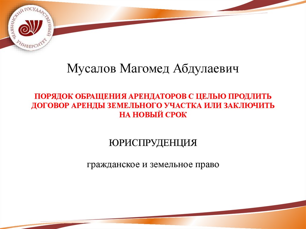 1. Мусалов Магомед Абдулаевич ПОРЯДОК ОБРАЩЕНИЯ АРЕНДАТОРОВ С ЦЕЛЬЮ ПРОДЛИТЬ ДОГОВОР АРЕНДЫ ЗЕМЕЛЬНОГО УЧАСТКА ИЛИ ЗАКЛЮЧИТЬ НА