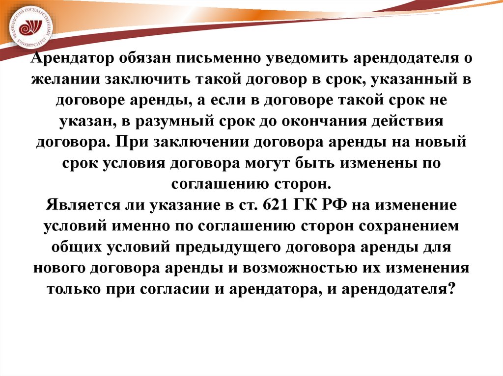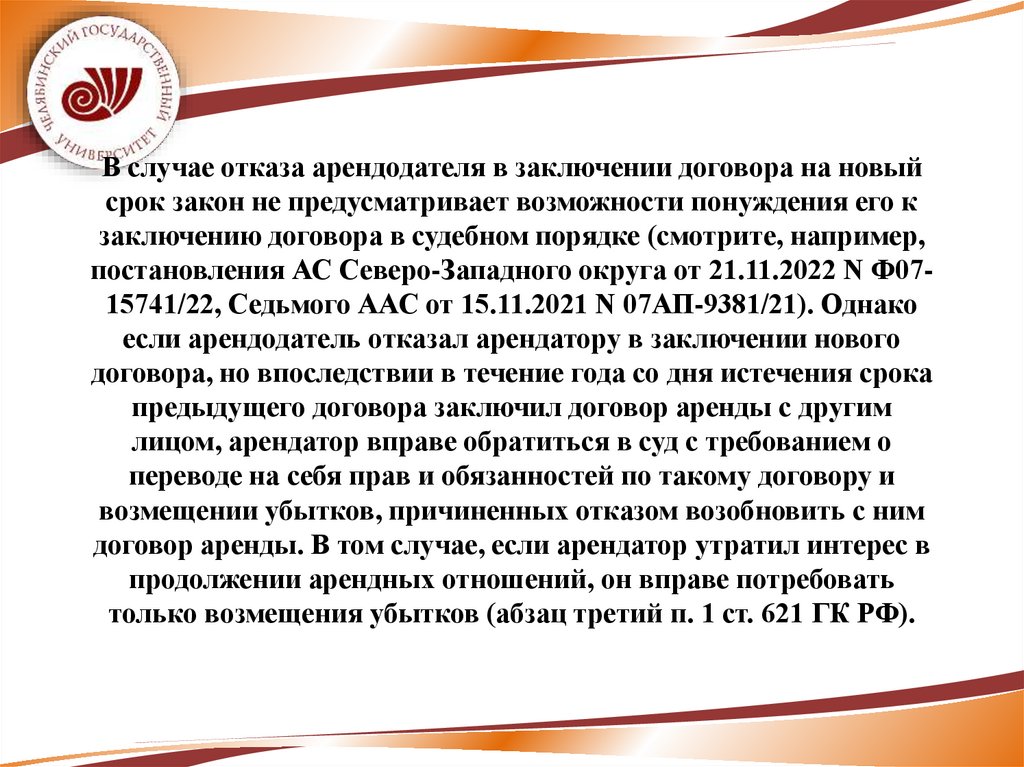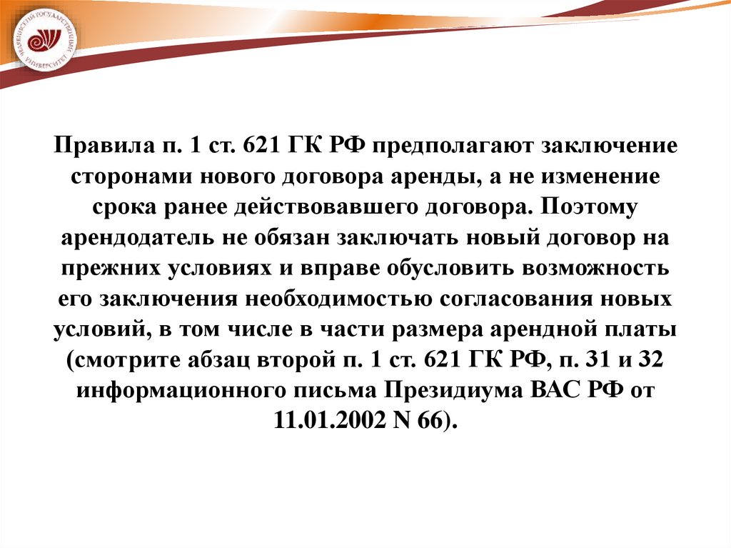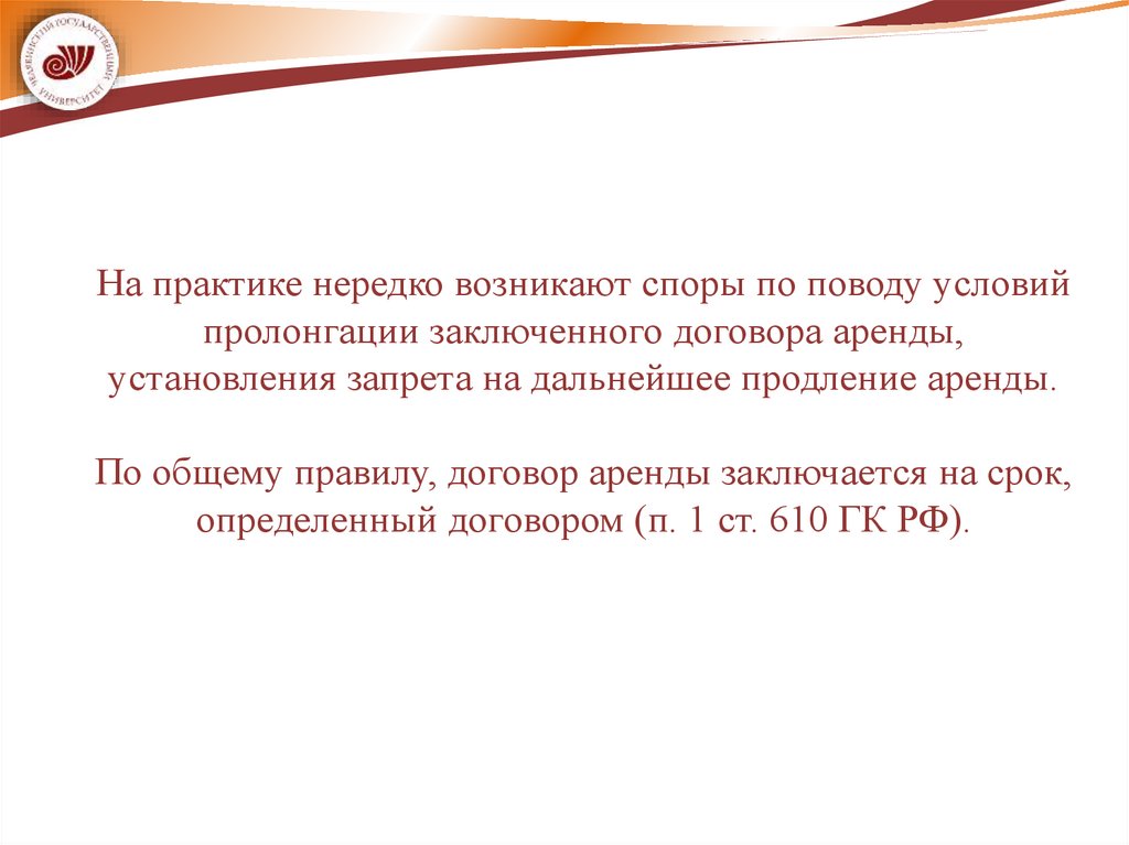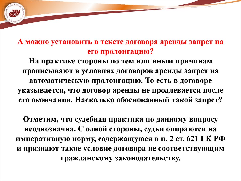 2. На практике нередко возникают споры по поводу условий пролонгации заключенного договора аренды, установления запрета на