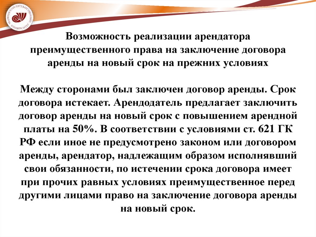 11. Возможность реализации арендатора преимущественного права на заключение договора аренды на новый срок на прежних условиях Между