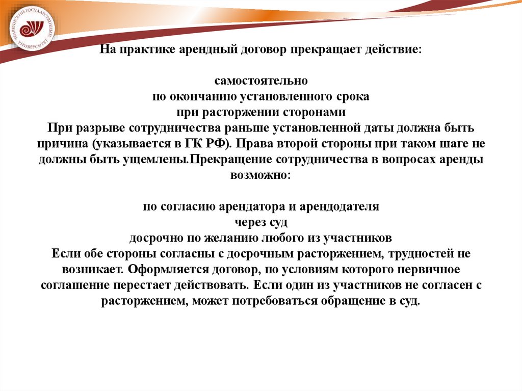 20. На практике арендный договор прекращает действие: самостоятельно по окончанию установленного срока при расторжении сторонами
