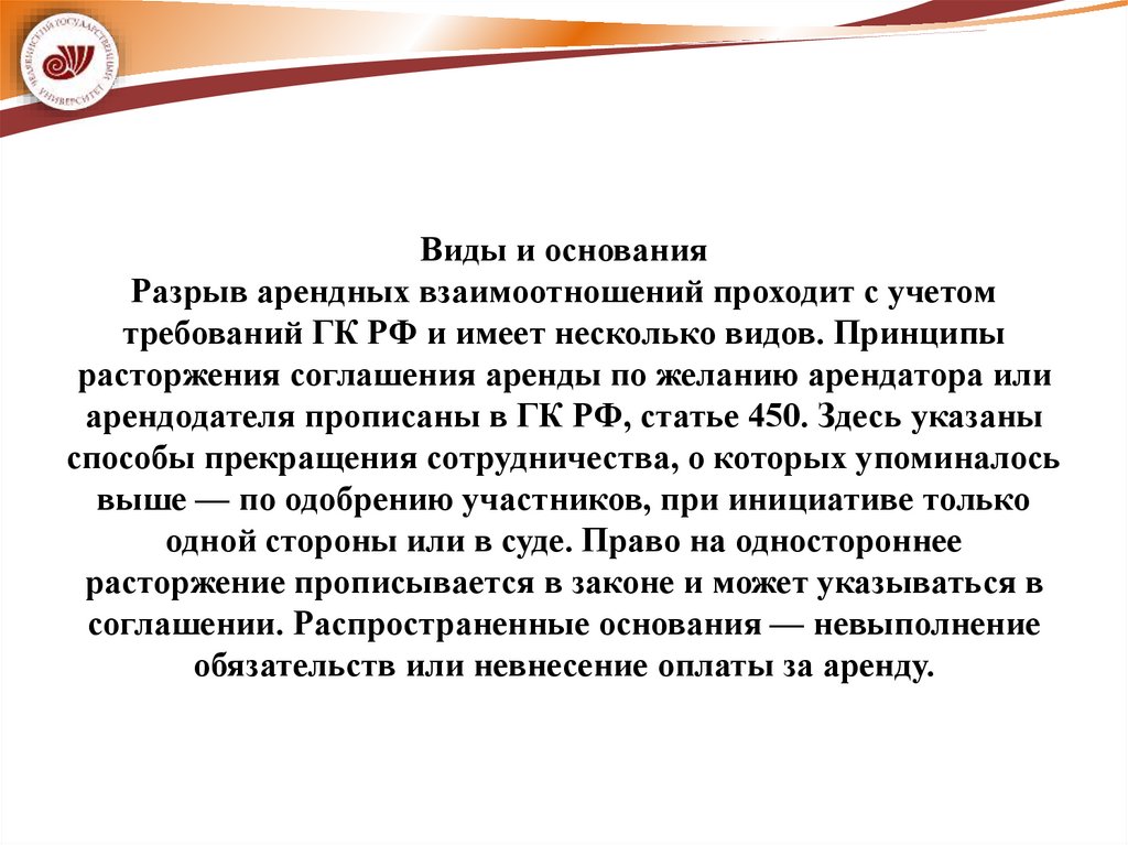 21. Виды и основания Разрыв арендных взаимоотношений проходит с учетом требований ГК РФ и имеет несколько видов. Принципы