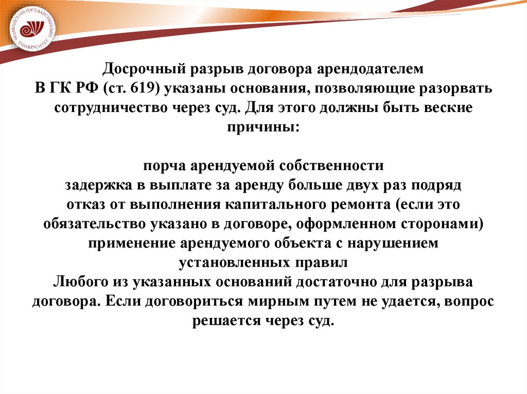 22. Досрочный разрыв договора арендодателем В ГК РФ (ст. 619) указаны основания, позволяющие разорвать сотрудничество через суд.