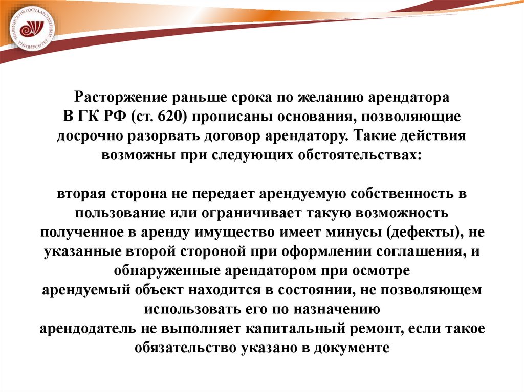 23. Расторжение раньше срока по желанию арендатора В ГК РФ (ст. 620) прописаны основания, позволяющие досрочно разорвать договор