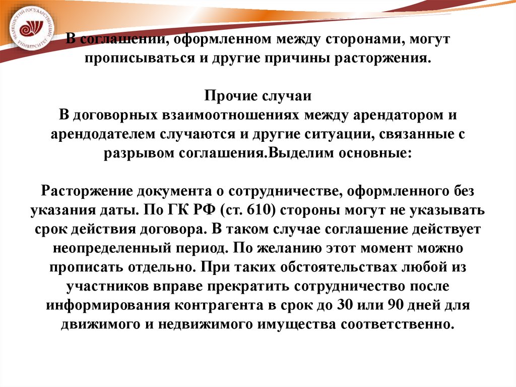24. В соглашении, оформленном между сторонами, могут прописываться и другие причины расторжения. Прочие случаи В договорных