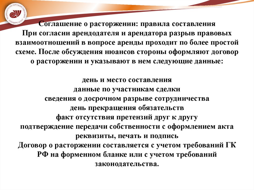 26. Соглашение о расторжении: правила составления При согласии арендодателя и арендатора разрыв правовых взаимоотношений в вопросе