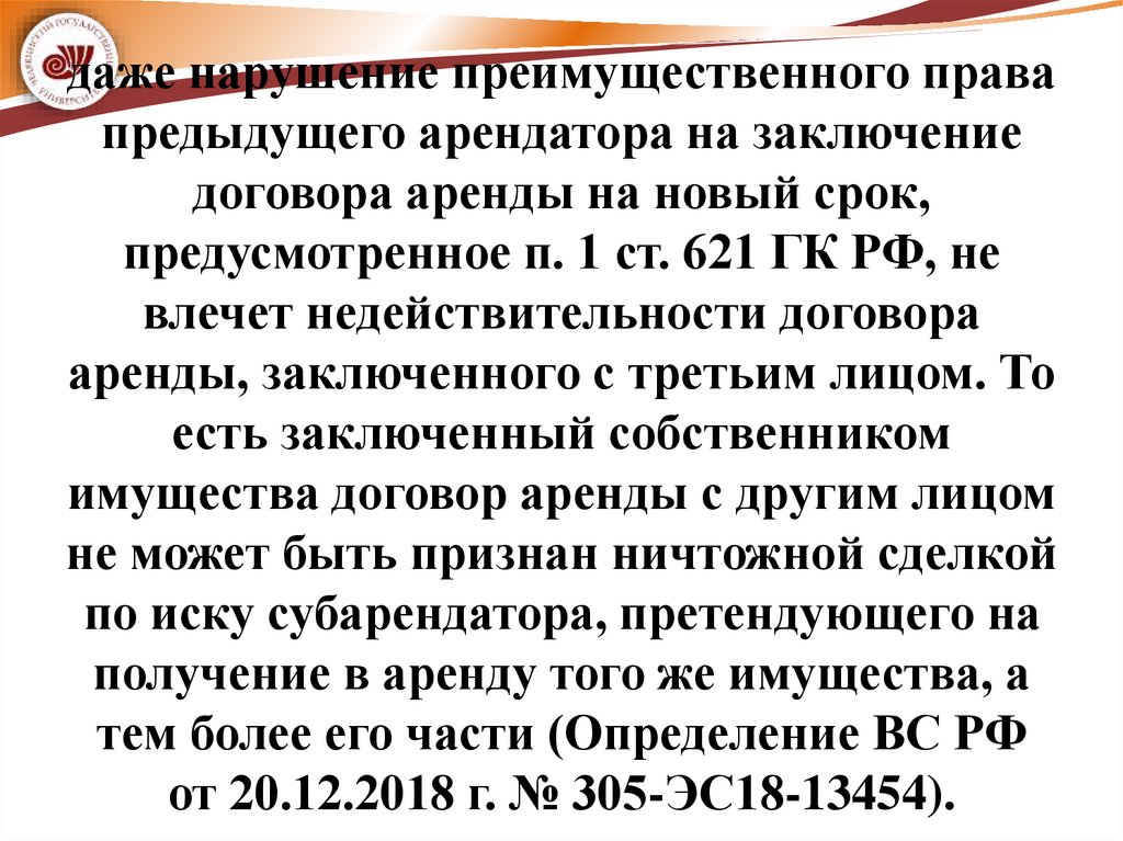4. даже нарушение преимущественного права предыдущего арендатора на заключение договора аренды на новый срок, предусмотренное п. 1