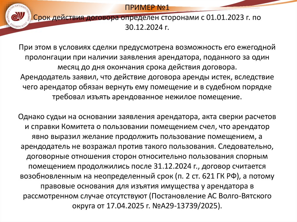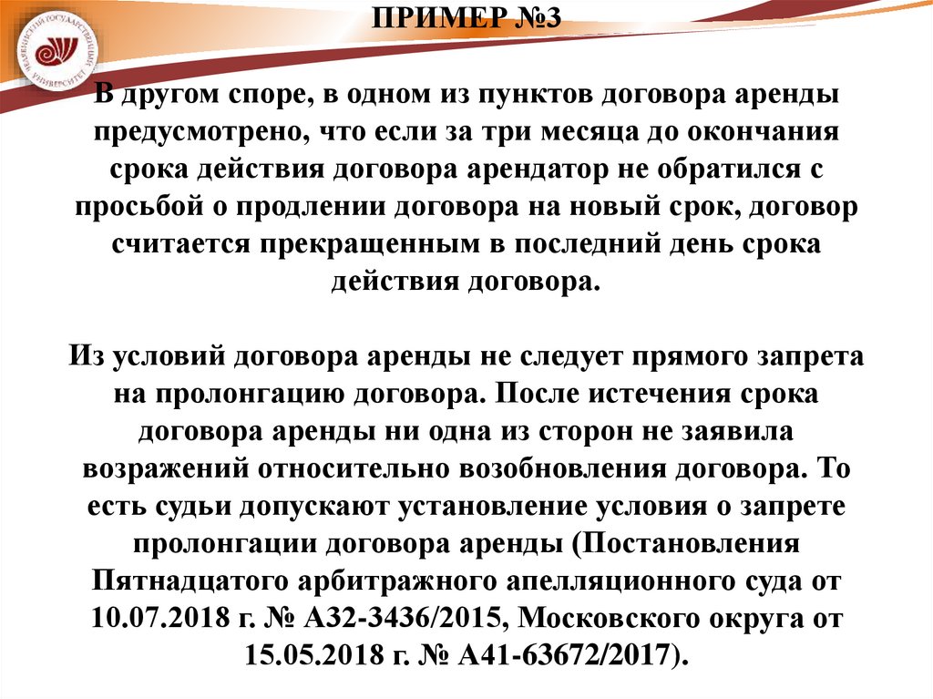 10. ПРИМЕР №3 В другом споре, в одном из пунктов договора аренды предусмотрено, что если за три месяца до окончания срока действия