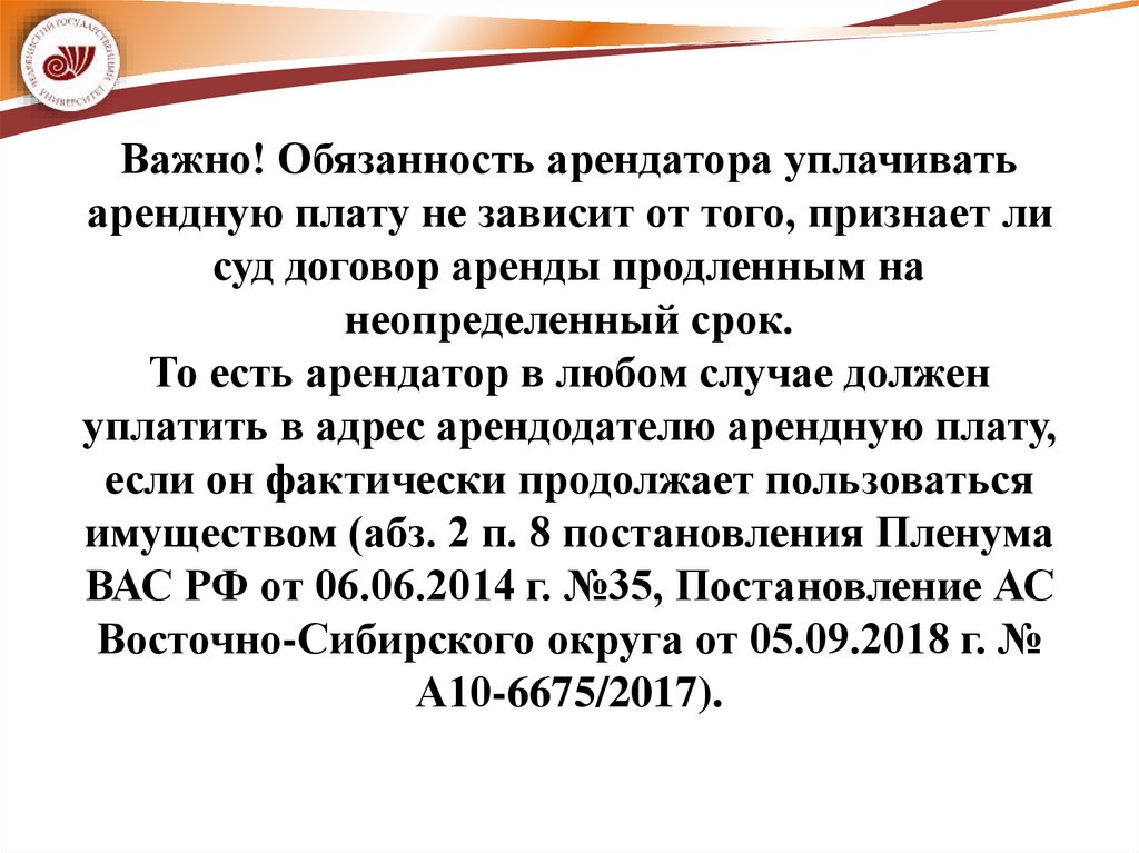 7. Важно! Обязанность арендатора уплачивать арендную плату не зависит от того, признает ли суд договор аренды продленным на