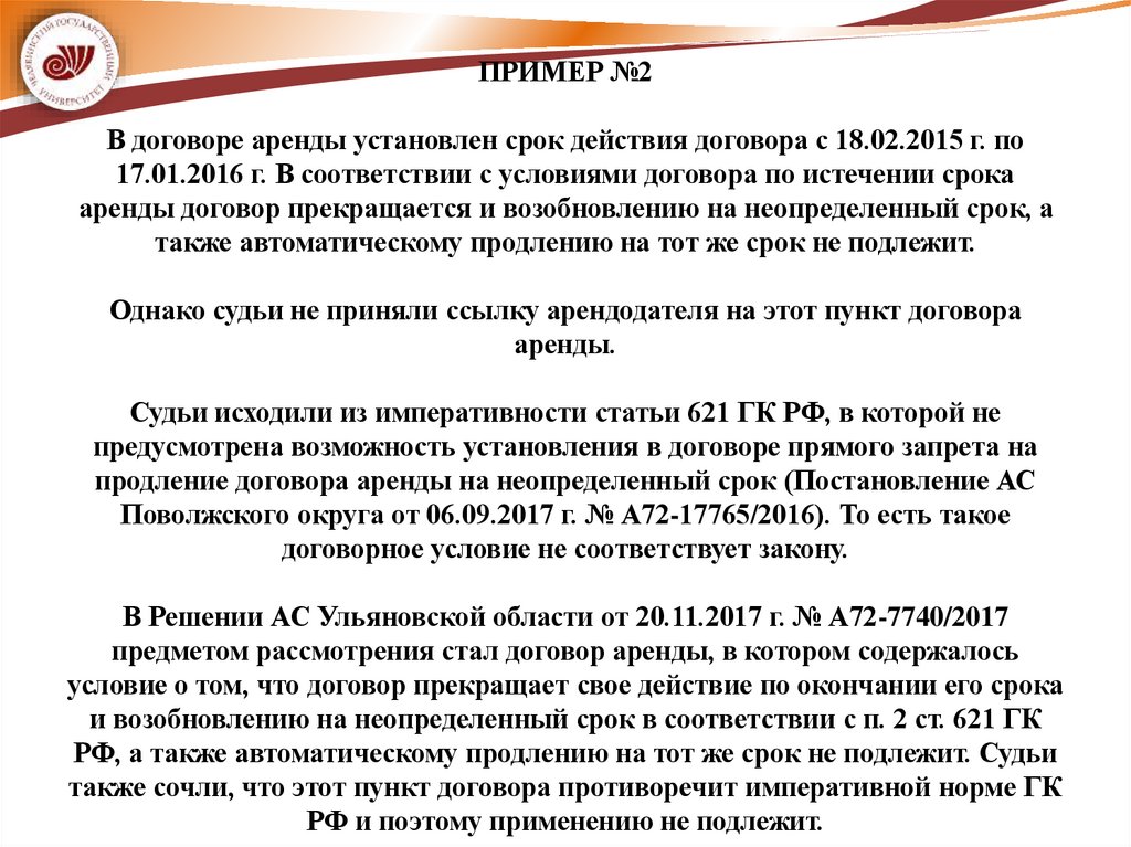 9. ПРИМЕР №2 В договоре аренды установлен срок действия договора с 18.02.2015 г. по 17.01.2016 г. В соответствии с условиями