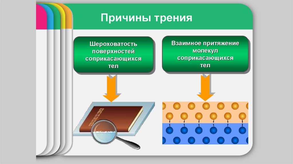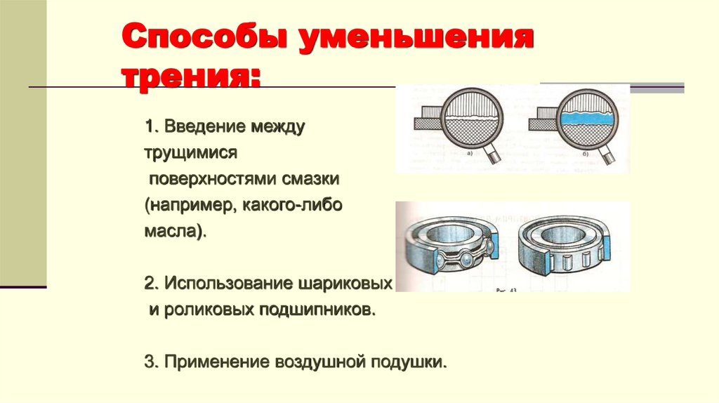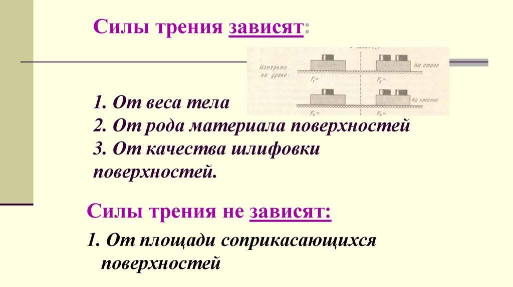 8. Силы трения зависят: 1. От веса тела 2. От рода материала поверхностей 3. От качества шлифовки поверхностей.