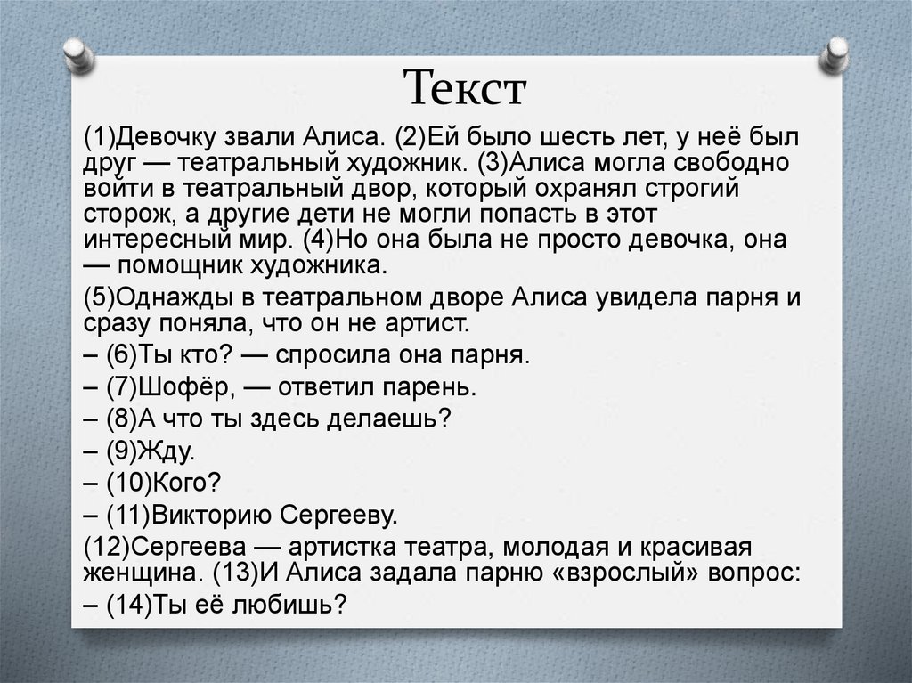 (1)Девочку звали Алиса. (2)Ей было шесть лет, у неё былдруг — театральный художник. (3)Алиса могла свободно