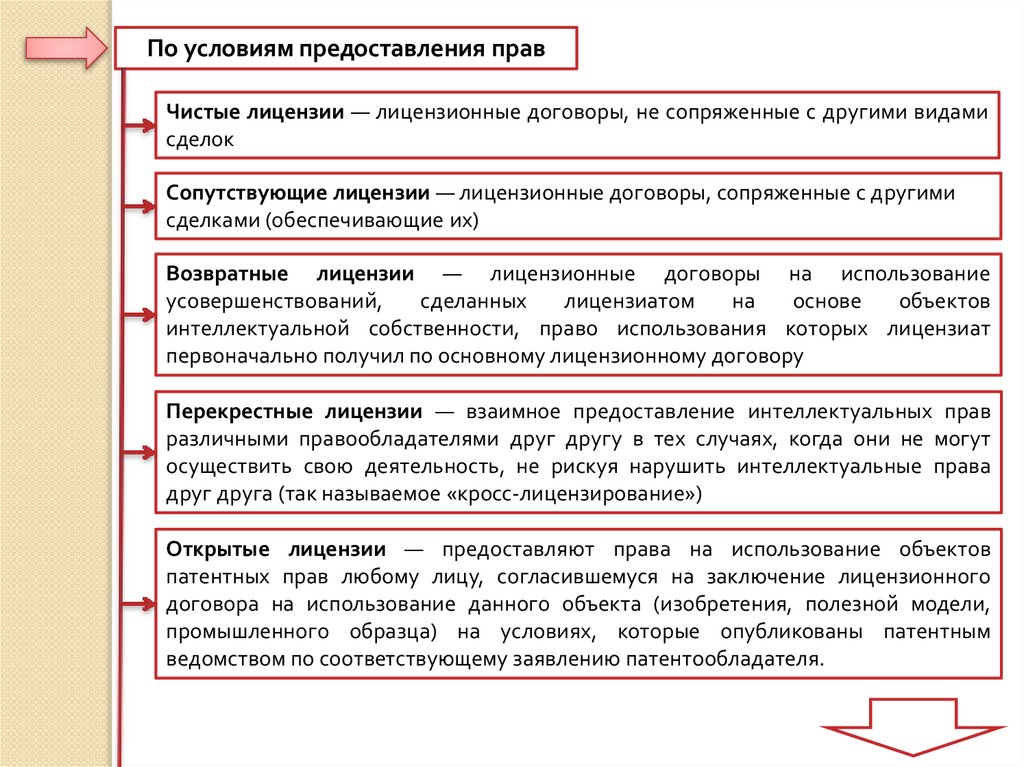 По условиям предоставления правЧистые лицензии — лицензионные договоры, не сопряженные с другими видами