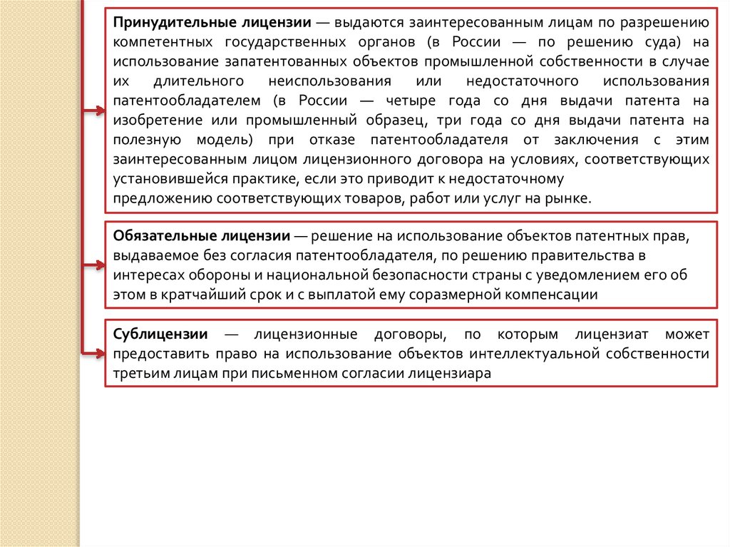 Принудительные лицензии — выдаются заинтересованным лицам по разрешениюкомпетентных государственных органов (в России — по решению суда) на