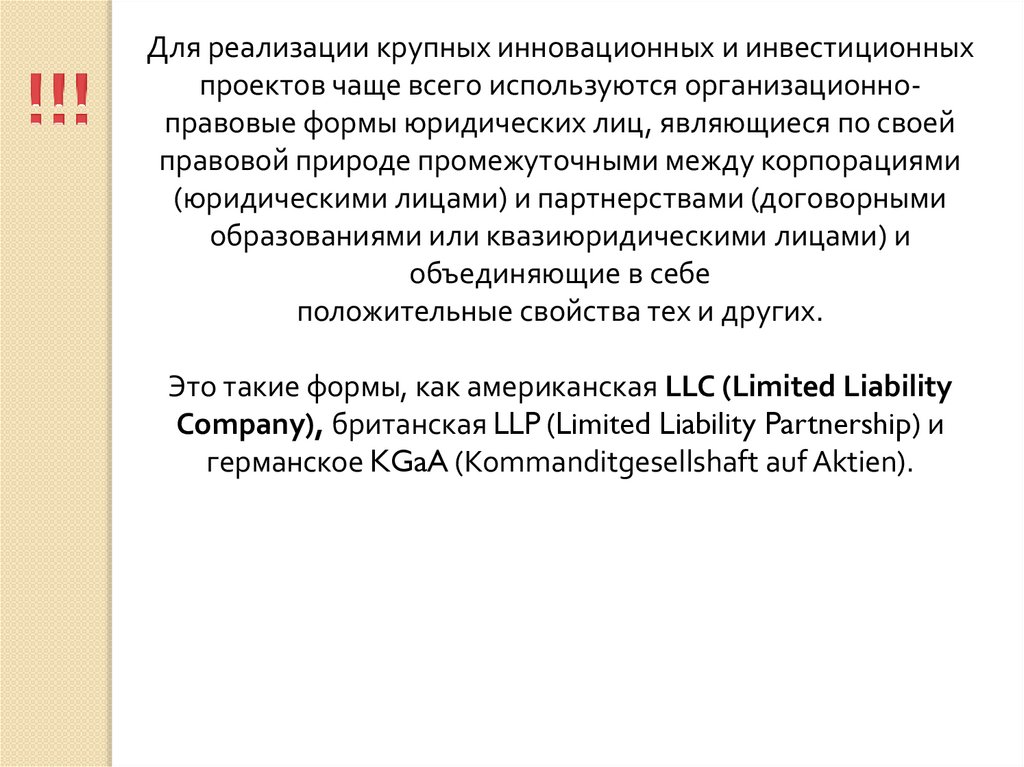 Для реализации крупных инновационных и инвестиционныхпроектов чаще всего используются организационноправовые формы юридических лиц, являющиеся по своей