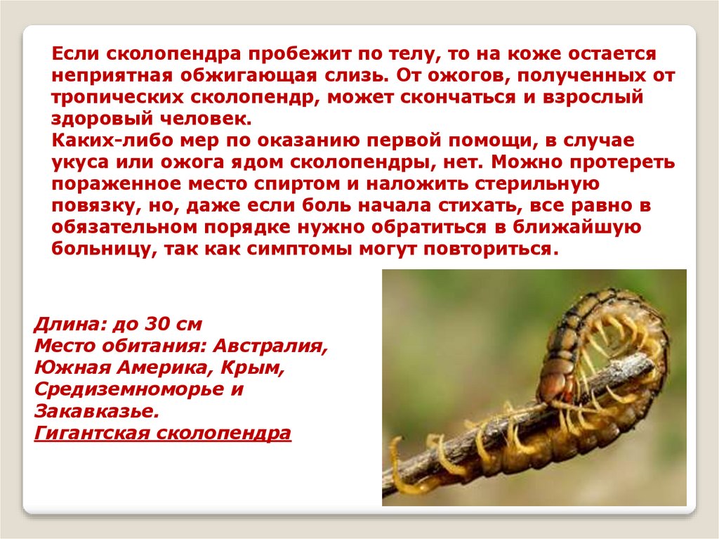 Если сколопендра пробежит по телу, то на коже остаетсянеприятная обжигающая слизь. От ожогов, полученных от
