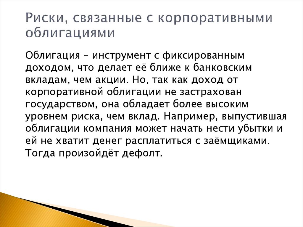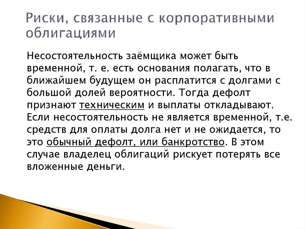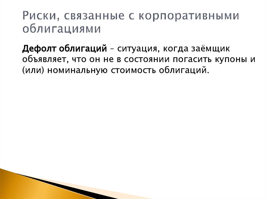 Дефолт облигаций – ситуация, когда заёмщикобъявляет, что он не в состоянии погасить купоны и