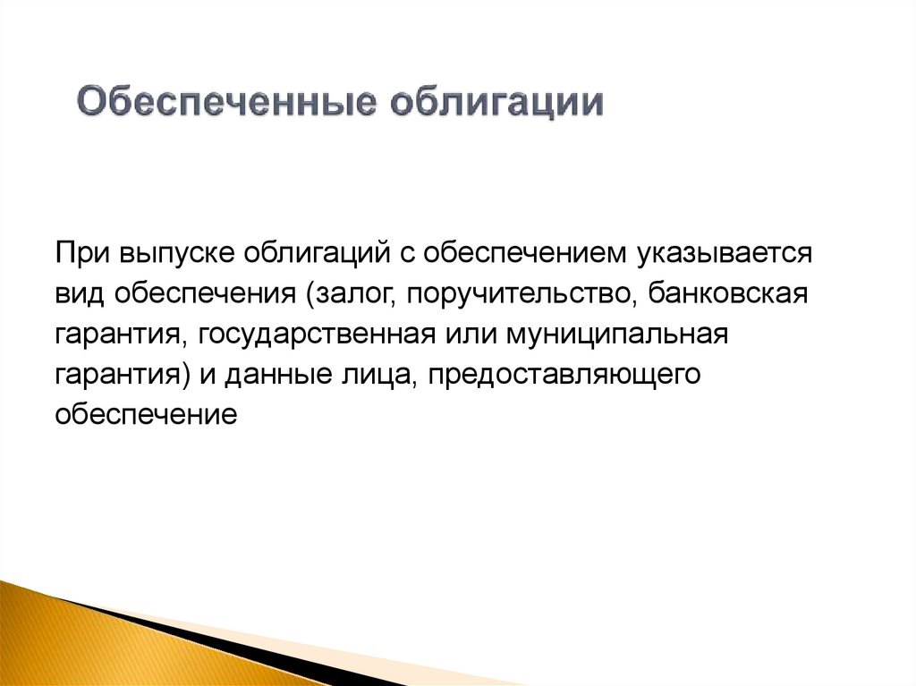 При выпуске облигаций с обеспечением указываетсявид обеспечения (залог, поручительство, банковская
