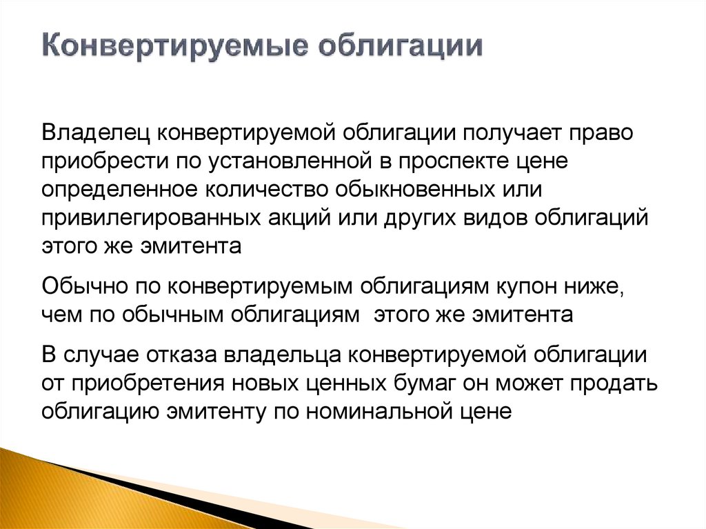 Владелец конвертируемой облигации получает правоприобрести по установленной в проспекте цене