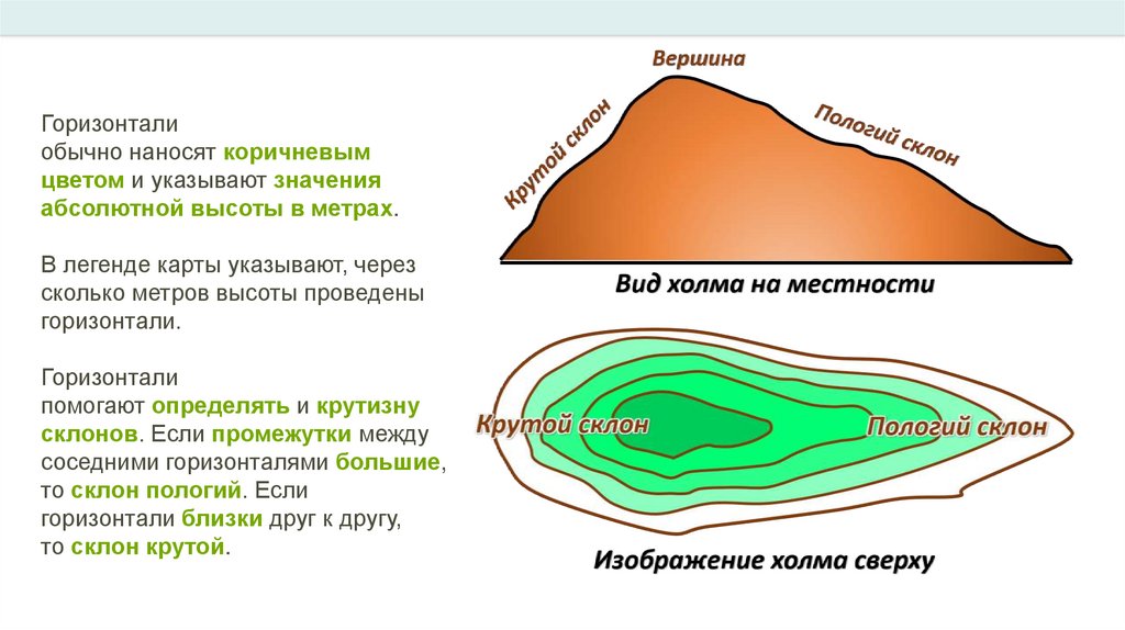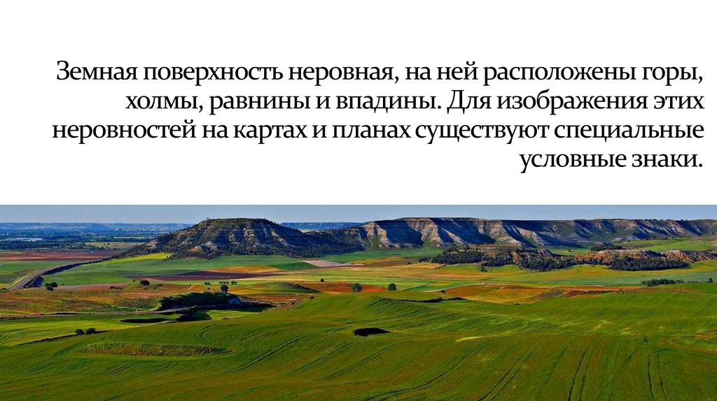 2. Земная поверхность неровная, на ней расположены горы, холмы, равнины и впадины. Для изображения этих неровностей на картах и