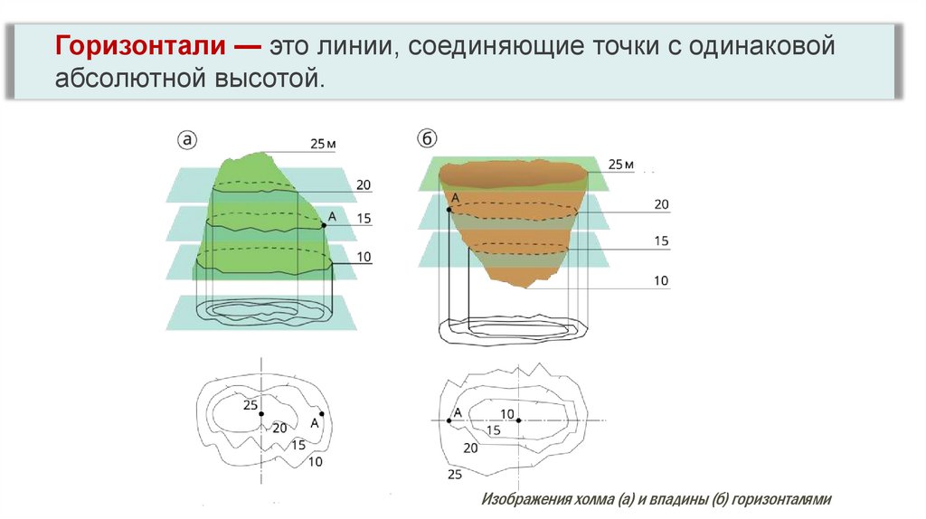 Горизонтали — это линии, соединяющие точки с одинаковойабсолютной высотой.