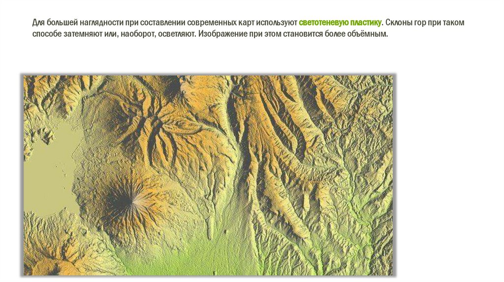 Для большей наглядности при составлении современных карт используют светотеневую пластику. Склоны гор при такомспособе затемняют или, наоборот, осветляют. Изображение при этом становится более объёмным.